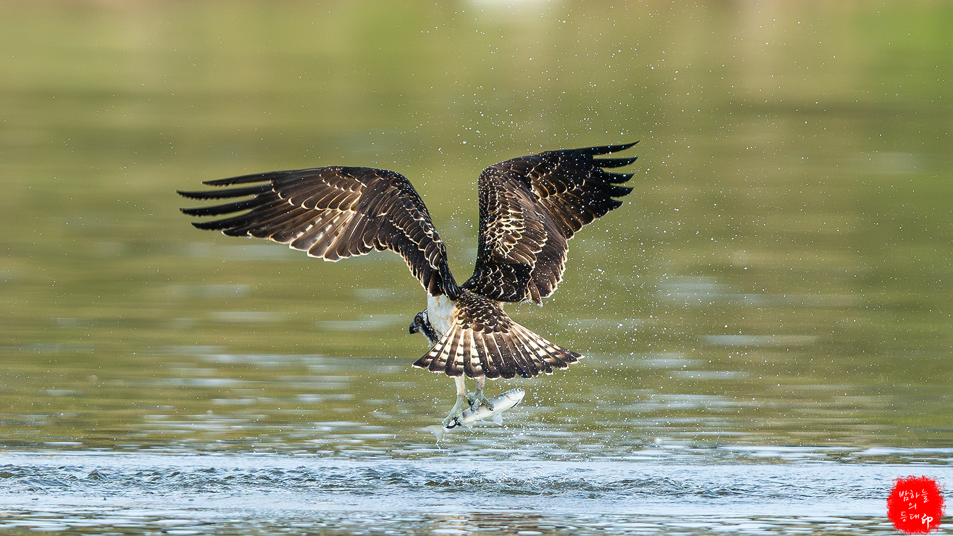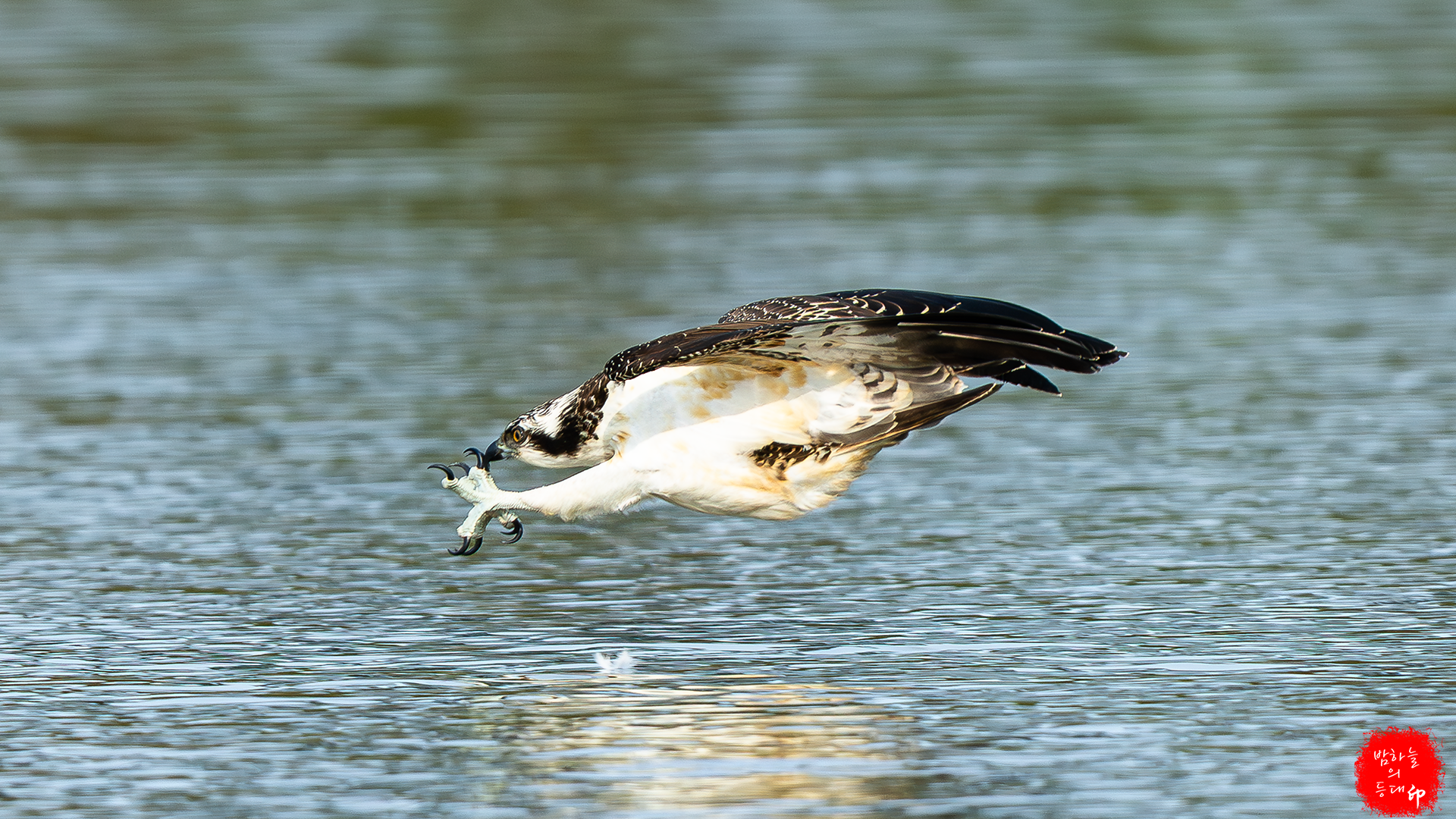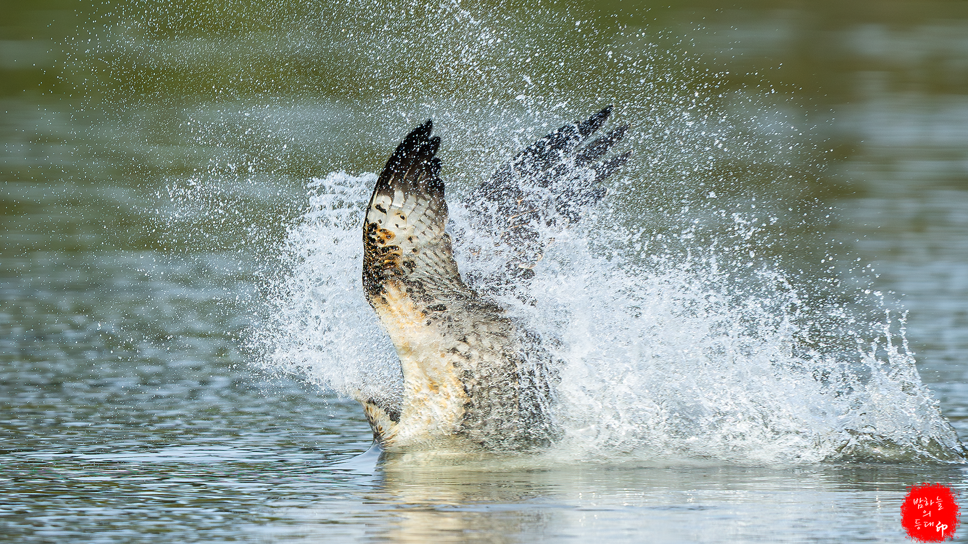 한순간! 진사들의 사각지대 머리 위로 나타난 물수리가 첨벙 사냥하고 사라진다.